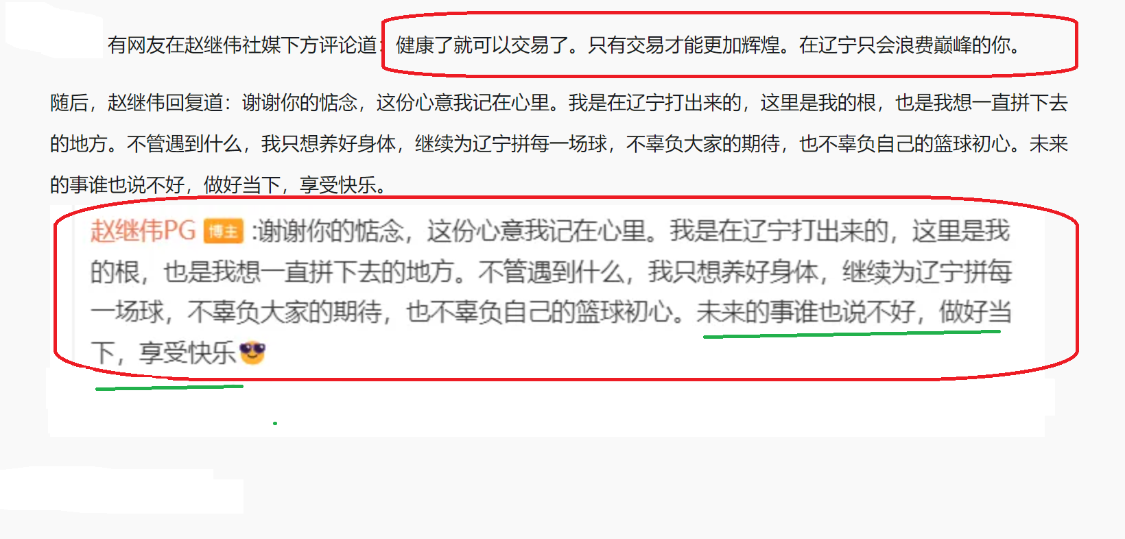 值得一提的是,面对球迷的关心,赵继伟也是进行了回应,表示十分感谢球迷的关心,这些话自己也会铭记。不过,辽宁队培养了自己,因此,只要在辽宁队效力一天,就会努力一天,不辜负辽宁队的培养和信任。至于未来会不会离开辽宁队,赵继伟表示未来的事,谁也是说不清楚。