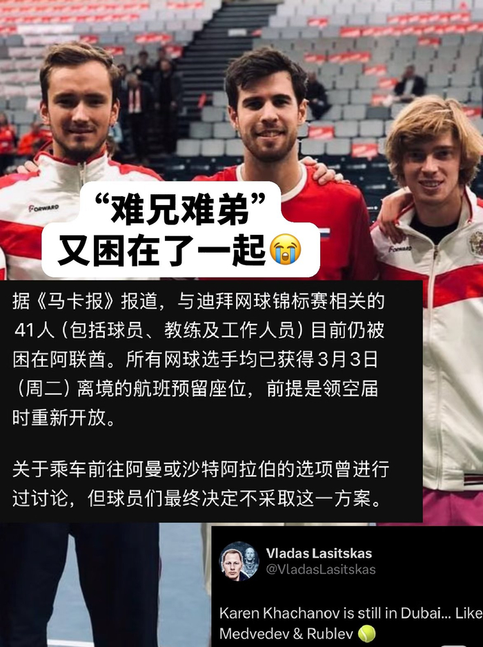 为了不影响印第安维尔斯大师赛的顺利开展,ATP也迅速给出了这41人离开迪拜的两个撤离方案:一是乘车6小时走阿曼这条路;二是乘车10小时从沙特利雅得搭乘飞机离开。