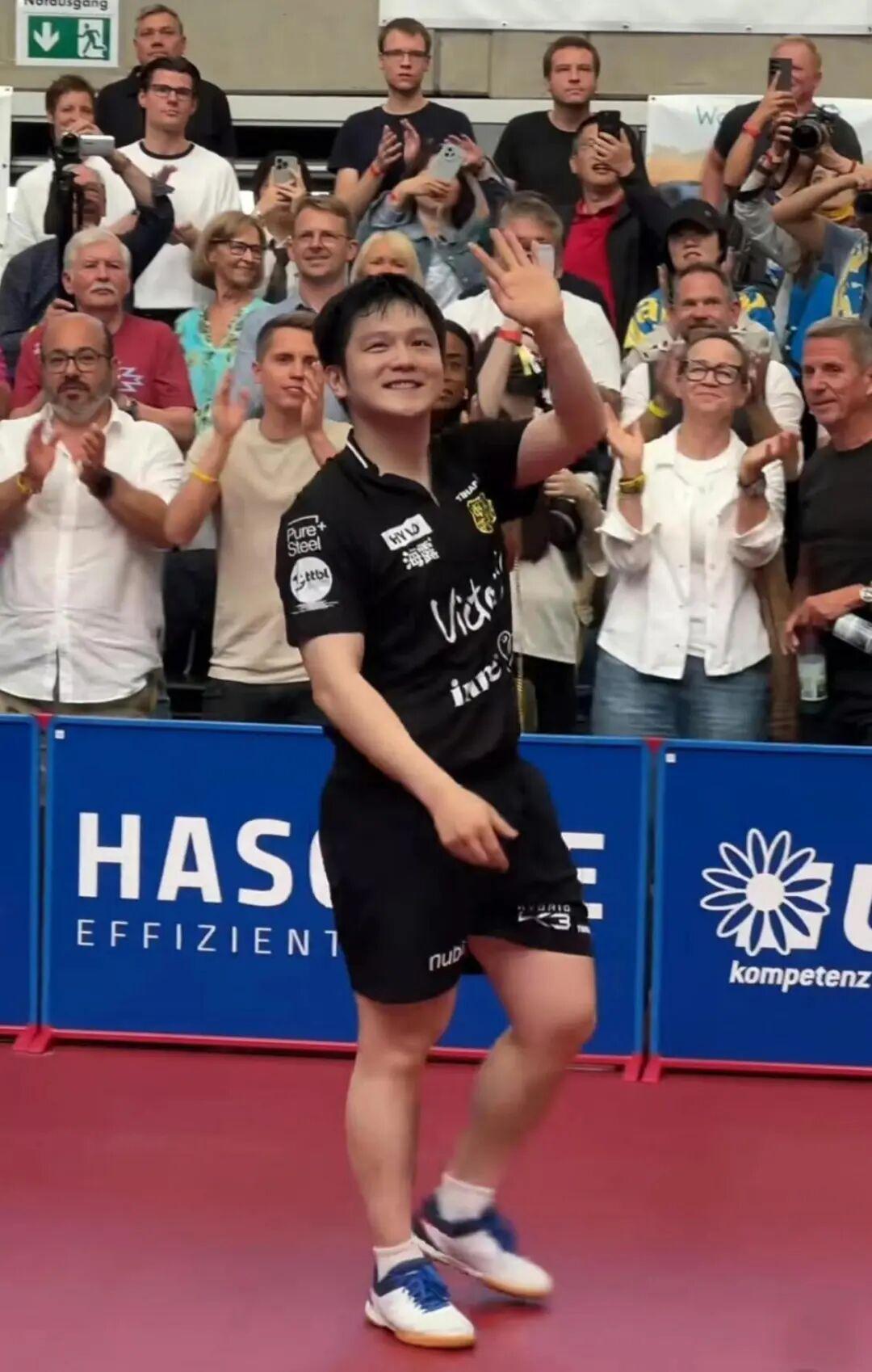 前来观赛的除了一些华人球迷,也有不少德国当地人。原本樊振东在比赛结束后,与对手及团队致意,已经准备离开赛场。或许是看到球迷过于热情,他又踏进场地,再次挥手,向全场球迷致谢。